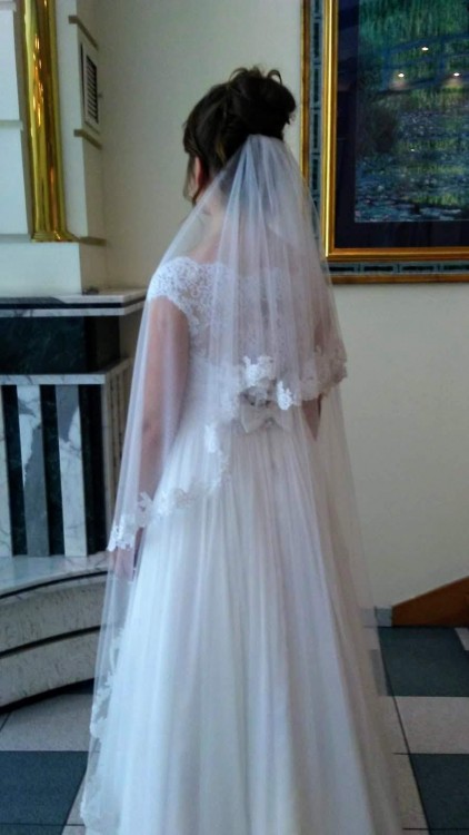Halka z kołem, długi welon z obszyciem koronkowym i pokrowiec w cenie.