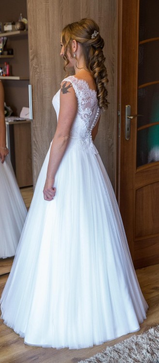 Mam do sprzedania suknię firmy Nabla w kolorze śnieżnobiałym, model Patie szytą na miarę (październik 2017). Góra sukni wykonana jest z pięknej koronki wyszytą koralikami które pięknie odbijają światło. Tiulowa spódnica jest odcinana w talii, idealnie podkreśla kobiece kształty:)