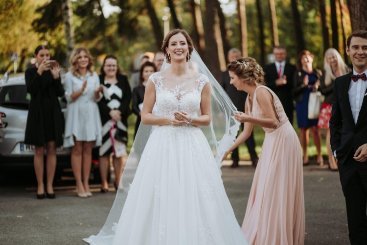 Góra sukni pokryta jest delikatną koronką, dół natomiast uszyty jest z pięknego tiulu z ozdobną subtelną koronką. Dodatkowym atutem jest długi (upinany) tren, który podczas ceremonii prezentuje się zjawiskowo razem z cudownym zwiewnym 2.5 m welonem. Cena salonowa welonu 700,00 zł. Suknia posiada wszyty gorset, który pięknie podkreśla talię i wyszczupla. Do sukni został wszyty biustonosz, który w każdym momencie można odpruć i przyszyć pasujący do swoich rozmiarów. Krój sukni w literę A.