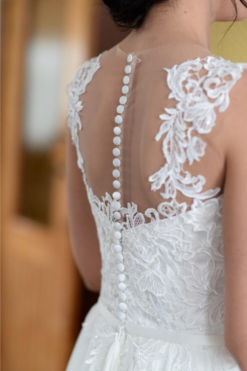 Suknia posiada długi tren z możliwością podpięcia. Dół sukni wykonany jest z delikatnego muślinu w kolorze śmietankowym. Siateczka na dekolcie i plecach jest w kolorze cielistym, praktycznie niewidoczna.