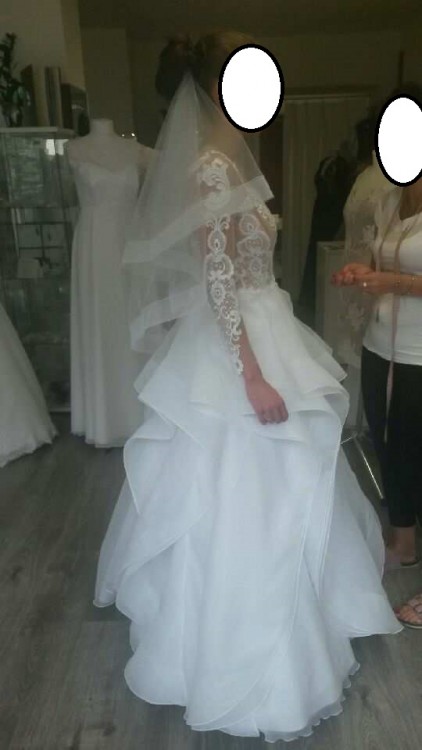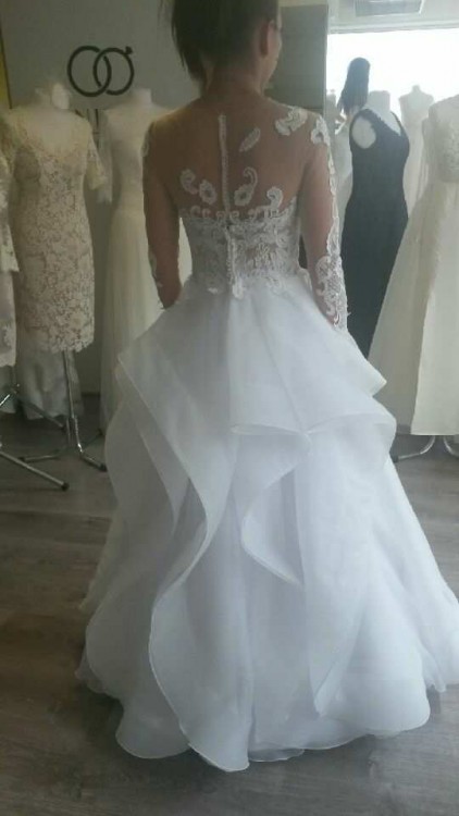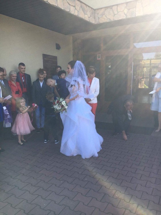 Suknia ma fason litery A, zachwyca pięknymi pionowymi falami, które nie pogrubiają. Z tyłu równie efektowna koronka na przezroczystym materiale .. Góra sukni bardzo stabilna, zapinana na guziczki. Jest to sukienka idealna do tańca jak i do swobodnego poruszania się. Z tą sukienką czujesz po prostu elegancko i wytwornie, a przede wszystkim nie zgubisz się w tłumie ludzi weselnych. Suknię miałam na sobie tylko na ślubie. Jest w idealnym stanie, jak nowa(została wyprana pralni chemicznej). Możliwość przymiarki w okolicach Mysłowic po wcześniejszym uzgodnieniu telefonicznym. Cena sukni w salonie 3 800 zł. Sprzedam za 2200 zł.