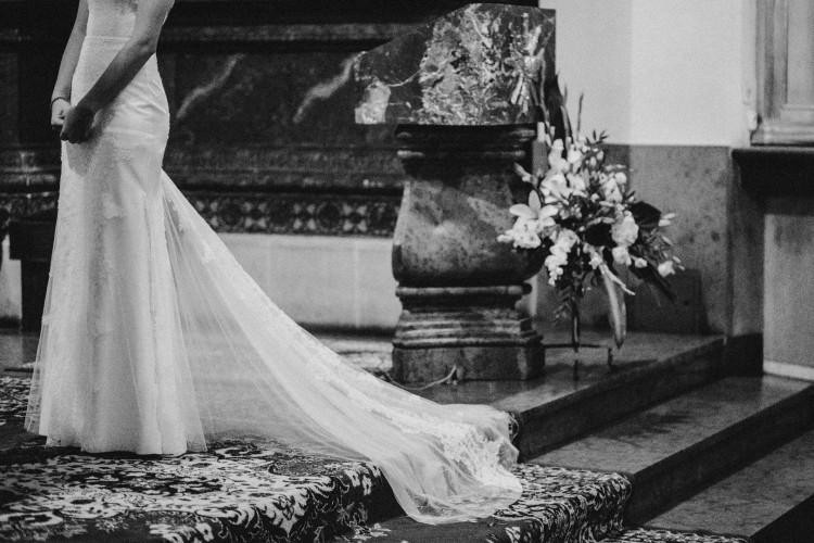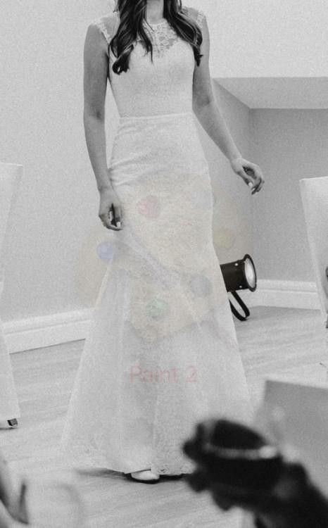 Suknia szyta na miarę, składa się z koronkowej góry, dopasowana do tułowia w typie syreny.