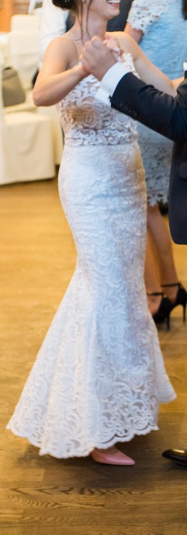 Mam do sprzedania suknię ślubną, fason syrenka. Jest ona uszyta z naturalnego haftu i posiada naturalna podszewkę z domieszką jedwabiu. Zapinana na zamek z kolorze ciała, przykryty guziczkami perełkami. Z przodu jest krótsza, tył natomiast jest dłuższy. Naturalny haft został zakupiony w Warszawie z salonie materiałów na suknie ślubne - wartość jego wynosiła 2000zł.
