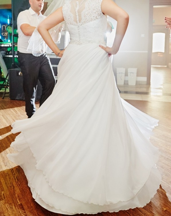 Całość sukni prezentuje się bardzo elegancko, a zarazem wdzięcznie i delikatnie.
