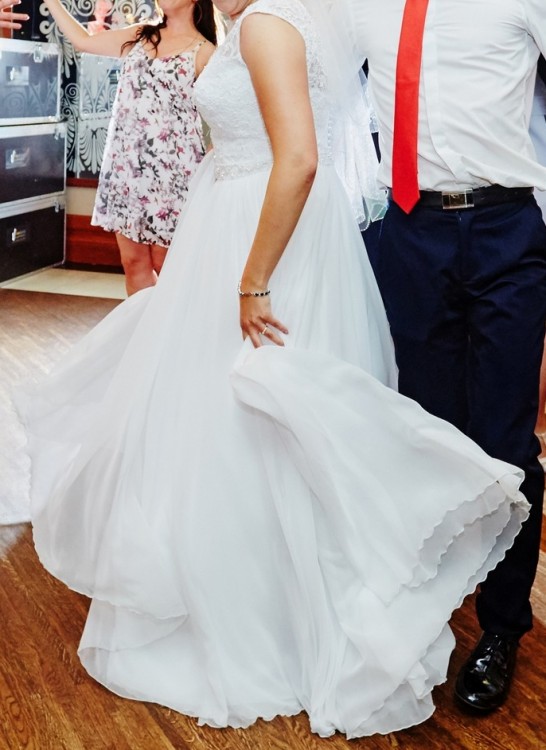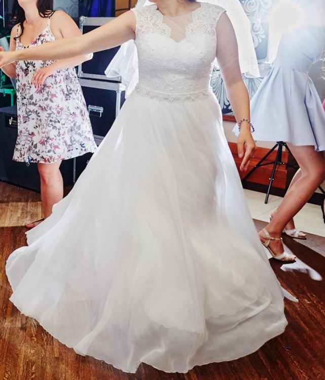 Do sprzedania piękna, biała suknia ślubna Nicea, z kolekcji Afrodyta 2017. Ozdobny pas, koronki, spódnica muślin.