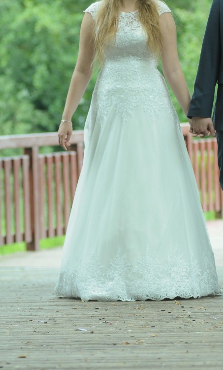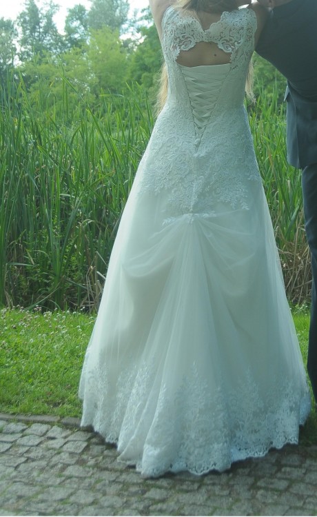 Suknia jest wygodna, pięknie się układa na ciele i w ruchu. Nie jest uszkodzona. Miałam ją na sobie 2 razy (w dzień ślubu oraz na plener). Po ślubie była prana, po plenerze również, ale leżała trochę w szafie więc trzeba jej zafundować czyszczenie.