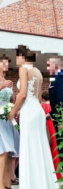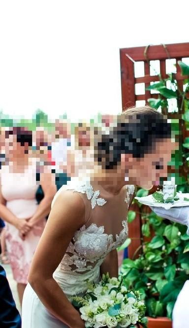 Suknia zapinana jest na ozdobne kryształowe guziki. Góra to cielista siateczka z naszytą koronką i kryształkami. W środku wszyte miseczki( miałam do niej założony silikonowy biustonosz samonośny z ramiączkami bez pleców). Posiada rozcięcie na środku zaczynające się od połowy uda.