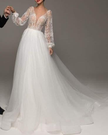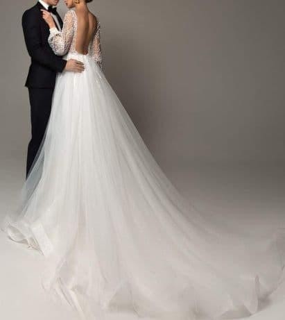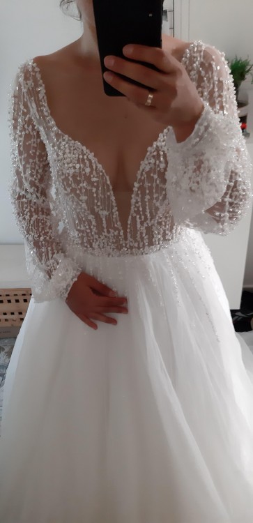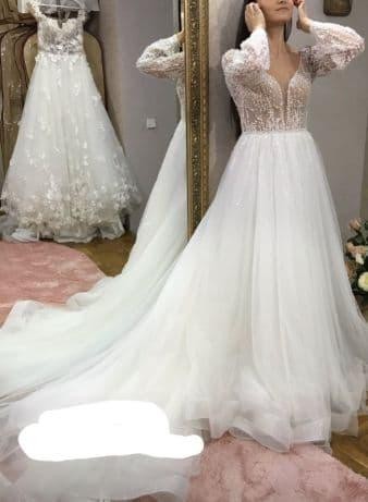 PROMOCJA! Sprzedam prześliczną NOWĄ suknię, sprowadzoną z zagranicy w cenie 5000 zł. Nigdy nie założona. Produkt europejski. Kolor Ivory. Rozmiar 34/36. Długość spódnicy od talii 125 cm. Na ok 180 cm wzrostu. Biust ok 84-88 cm, talia 68-72 cm. Zawsze można skócić ją z długości czy zrobić inne poprawki krawieckie - nieduży koszt. Rękaw dlugi. W biuście ma wszyte dwie cieliste miseczki. Góra posiada ciekawe ozdoby w postaci koralików, aplikacji kamyczków, cekinów i innych świecidełek. Cała pięknie się mieni. Z tyłu jest zapinana na zamek(dół). Plecy to przepiękny dekolt. Posiada podpinany tren. Można zrezygnować z trenu obcinając go do jednej długości. Sukienka jest przepiękna, taka nietuzinkowa i elegancka - robi piorunujące wrażenie. Zapraszam do kontaktu, z chęcią odpowiem na wszystkie pytania! :) W tej cenie już wysyłka kurierem z możliwością sprawdzenia paczki .
