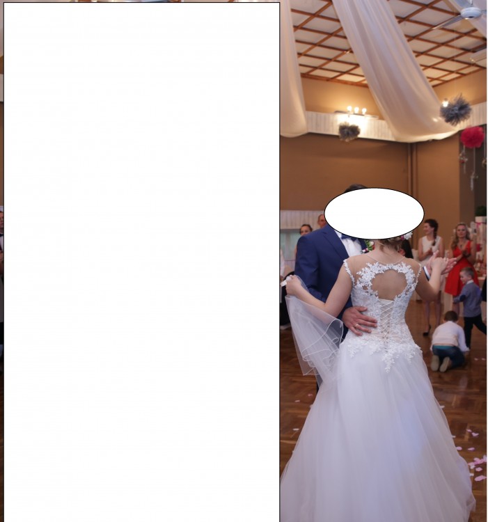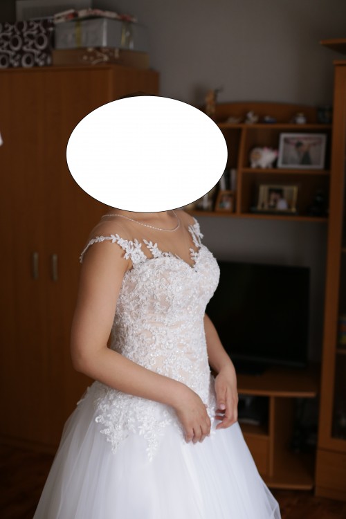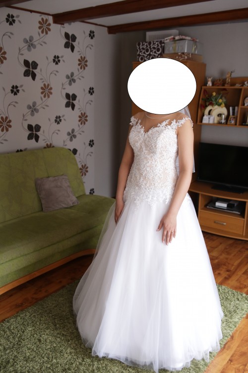 Sukienka górę posiada kolor nude z siatka co sprawia ze ozdoby z koronki wyglądają jak na gołym ciele- wygląda to ślicznie. Dól w kolorze bieli bez koła z delikatnego materiału. Sukienka wygodna, lekka i pięknie układa się w tańcu. Więcej pytań priv, Moge wysłać więcej zdj w razie potrzeby :)))