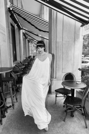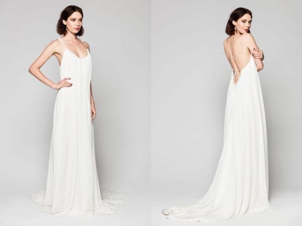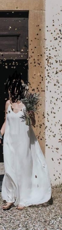 Suknia ma pięknie wycięte plecy, w całości wykonana jest z jedwabiu. Posiada tren, który bardzo łatwo można podpiąć. Możliwość noszenia jej na różne sposoby - puszczonej lużno lub przewiązanej sznureczkiem.