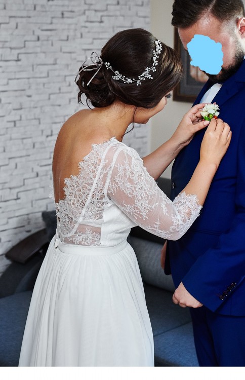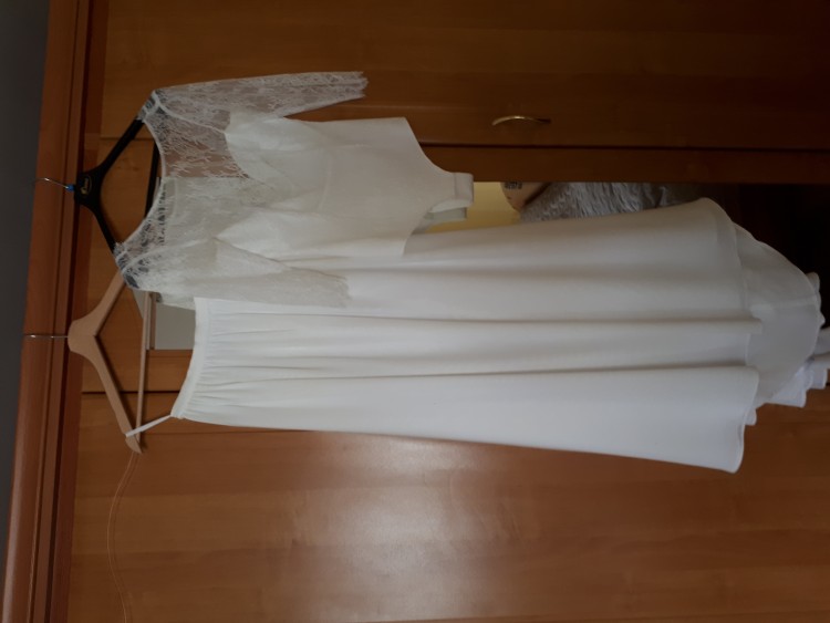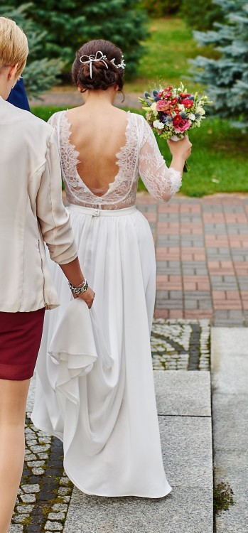 Suknia ślubna projektantki Karoliny Twardowskiej. Szyta na miarę w roku 2016. Suknia jest śmietankowa (nie biała). Dopasowane, wykończone koronką body i długa spódnica z trenem. Tren można z tyłu podpiąć. Suknia jest leciutka, romantyczna, zwiewna. Ma odkryte lecy.