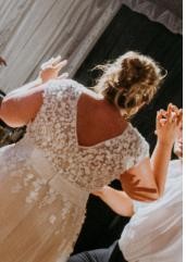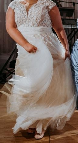 Będzie idealna dla Panny Młodej która szuka czegoś wyjątkowego na tle wszędobylskiej koronki. Szyta na wzrost 170cm + obcasy - suknia była obcinana "na oko" - było to zrobione celowo, nie wyglądała przez to jak uszyta pod linijkę, suknia i tiul pięknie się układały pomimo tego że suknia nie posiada gorsetu! Ma tylko wszyte fiszbiny żeby lepiej się układała.