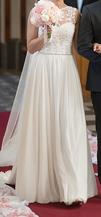 Suknia jest długa, posiada dopinany tren. ( muslinowy materiał, nie powoduje powstania "kuperka" przy upiętym trenie.)