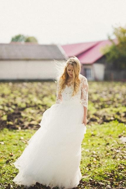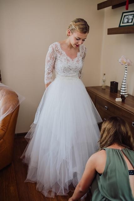 Góra dopasowana z pięknej ręcznie wyszywane koronki , dół cieniowany lekki, zwiewny tiul ( różni się od innych sukni, przymierzałam ich wiele i był sztywny i brzydko się układał ten jest idealny) . Bardzo wygodna, ultra lekka.