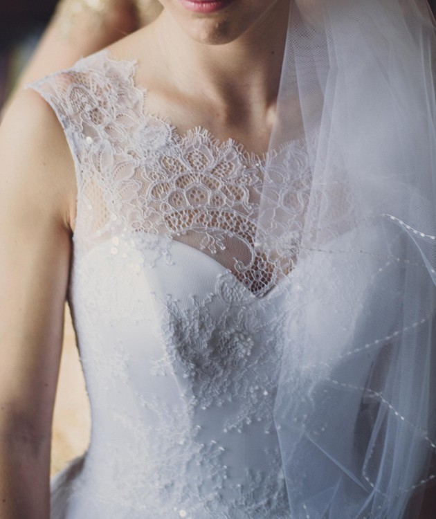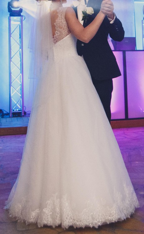Piękna, biała suknia ślubna z koronkowym dekoldem z tyłu typu openback.