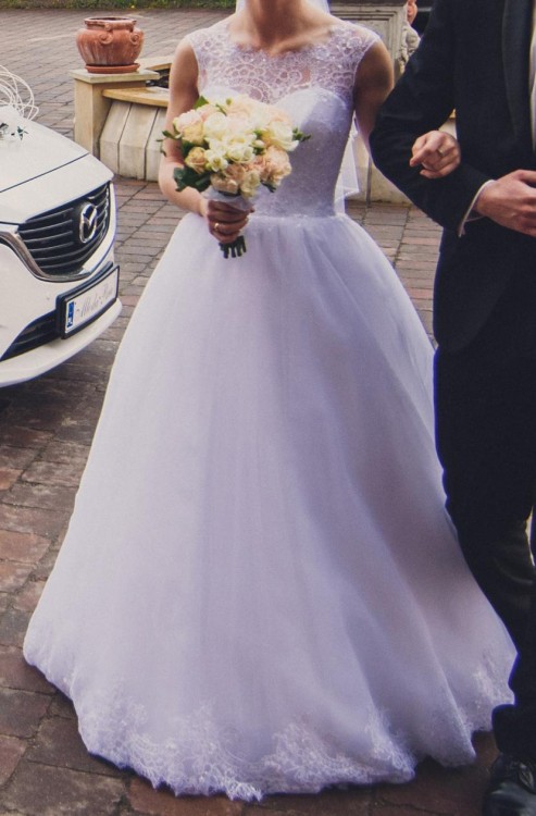 mam do sprzedania piękną białą suknię ślubną rozm. 34/36 zakupioną w salonie sukien ślubnych Adria, do wzrostu 165+ 7-10 cm na obcas. Suknia typu princeska, posiada dekold z tyłu typu openback i dół obszyty piękną koronką. Bardzo wygodna, dzięki grubszym rękawkom nie wpija się w ramiona. Suknia jest niezniszczona, po praniu w pralni.