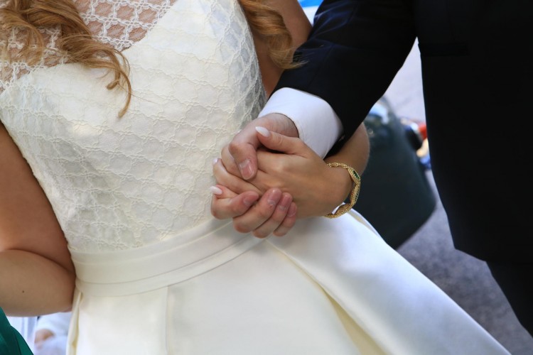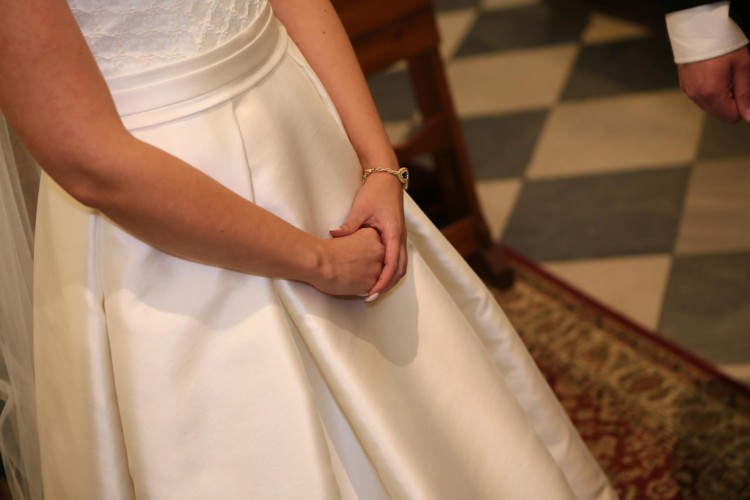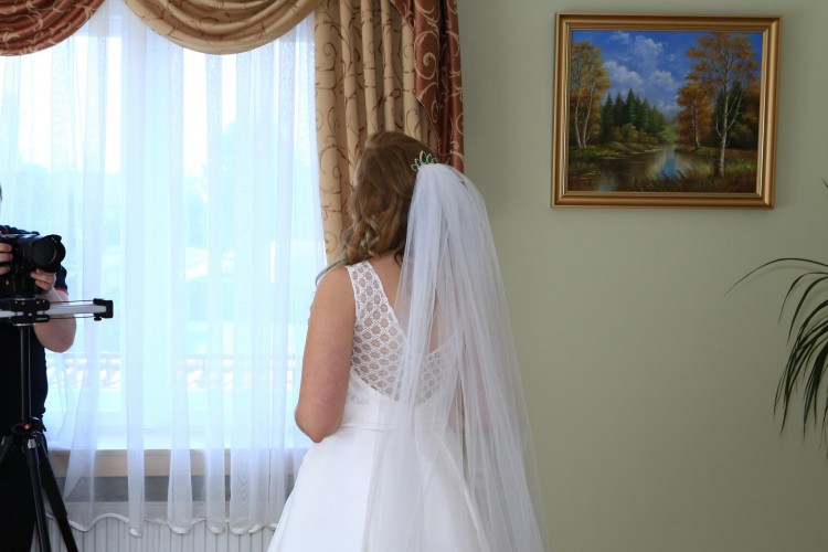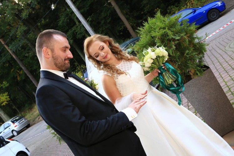 Suknia ślubna w kolorze śmietanki. Góra wykończona koronką. Tył sukni zapinany na 9 ręcznie wykonanych guziczków w kolorze złota i butelkowej zieleni. Do guzików w komplecie posiadam grzebyk do włosów, bransoletkę i kolczyki (cena do negocjacji). Gratis długi welon i halka z kołem, którą można założyć, ale nie trzeba. Suknia bardzo wygodna, pięknie się układa, nie mnie. Po ślubie została wyprana w pralni, nie ma śladów użytkowania nawet na dole spódnicy. Stan idealny. Wykonana została w salonie sukni ślubnych Glamur w Wadowicach.