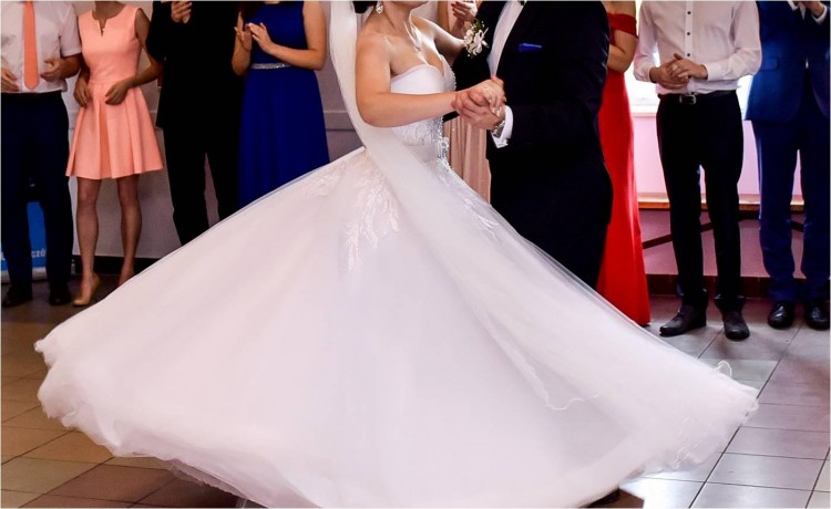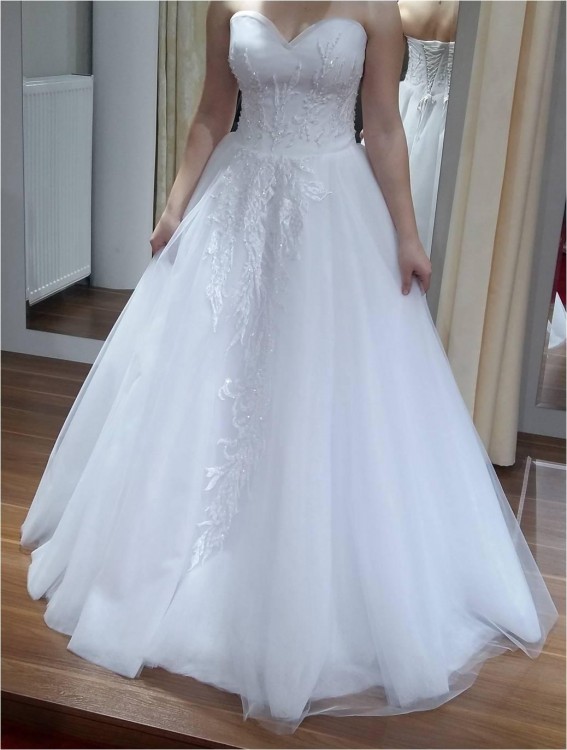 Suknia z dopiętą spódnicą o fasonie księżniczki, natomiast po odpięciu lekka i skromna w fasonie litery A. Pięknie zdobiona modnymi aplikacjami w kształcie gałęzi, w kolorze śnieżnobiałym. Zdecydowanym plusem jest sznurowany gorset, który można dopasować do sylwetki zarówno w rozmiarze 36, jak i 40. Suknia została poddana profesjonalnemu czyszczeniu w salonie, w którym była szyta.