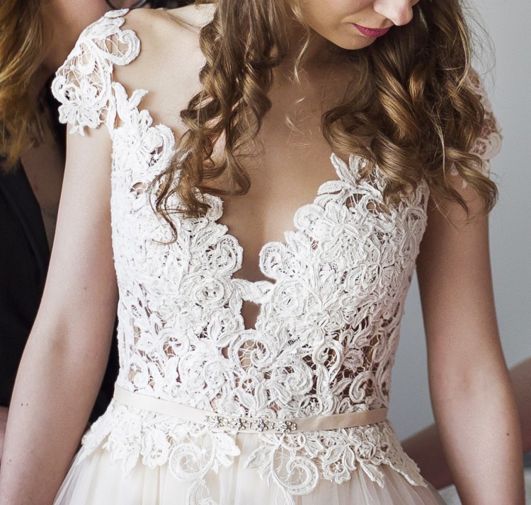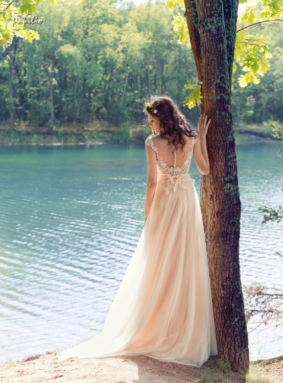 Pięknie wyszywana suknia (góra) z tiule (dół). Góra posiada także koroneczkę w kolorze ciała. Kolor góry to śmietanka a dół z racji tego, że ma wiele warstw tiulu ma kilka kolorów: śmietanka, brzoskwinia, róż, jest również halka pod spodem a między tiulami a halką jest jeszcze jeden błyszczący się kilkoma kolorami (w zależności od światła) materiał.
