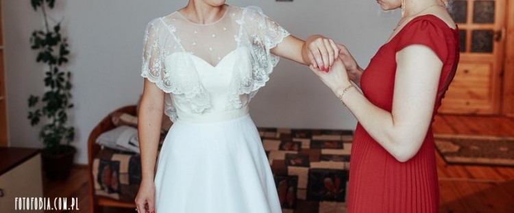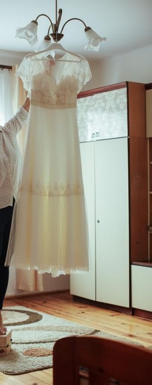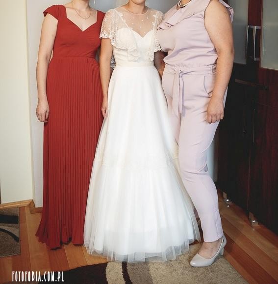 Sukienka nie ma większych śladów użytkowania, posiada zamek i dodatkowe wiązanie przez co łatwo ją dopasować. Bardzo wygodna i lekka. Razem z suknią w komplecie halka z kołem