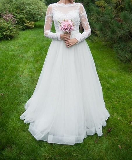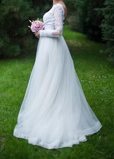 Mam do sprzedania suknię ślubna w rozmiarze 34/36. Doł sukni firmy Papilio, góra inspirowaną i uszyta na wzór sukień projektantki Sylwi Kopczyńskiej. Góra suknia wykonana z pięknej koronki francuskiej. Suknia posiada tren, który w razie potrzeby można przypiąc do sukni satynowymi guziczkami. Z tyłu sukni duży dekold na plecach, ktory dodaje całości uroku i zmysłowości. Do sukni dodaje gratis dwa welony: jeden krótki sięgający do pasa, drugi długi 2,5 metrowy.