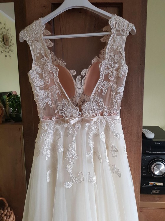 Mam do sprzedania przepiękną suknię w kolorze kremowym wraz z dwoma welonami. Suknia na metce ma rozmiar 36, natomiast została dopasowana do moich wymiarów. Długość całkowita sukni 148 cm, w pasie 70 cm, biust 87 cm, biodra 90 cm. Długi welon ma 167 cm, natomiast krótki 72 cm długości. Suknia (model 1748) została kupiona w Salonie Freya w Szczecinie. Halka była wypożyczona w salonie. Suknia na dwóch pierwszych warstwach tiulu jest delikatnie rozcięta, ale na pierwszy rzut oka tego nie widać:) Istnieje możliwość wymiany tych warstw w salonie w którym została kupiona. Często bywam w Szczecinie, dlatego z naprawą nie będzie problemu ;) Koszt naprawy w granicach 500-600 zł.