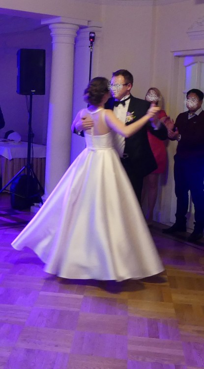 Suknia pięknie układa się w tańcu. Do sukni miałam oddzielnie założoną halkę na "kole", dzięki czemu suknia efektownie się układała. Halka jednak nie jest konieczna, jeśli chcesz osiągnąć bardziej rustykalny look, poruszanie się w sukni bez halki i z halką nie stwarza żadnych kłopotów.