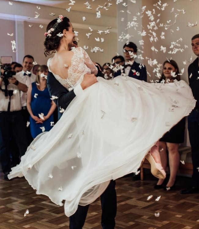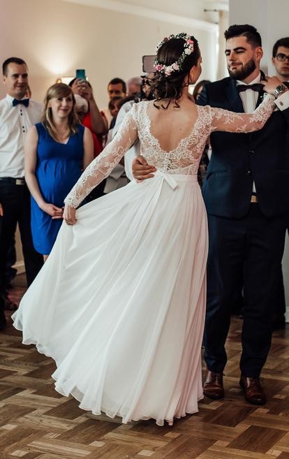 Koronka jest niezwykle miękka i wygodna. Dół sukni uszyty jest z muślinu, który jest bardzo wdzięcznym materiałem pięknie układającym się w tańcu. Długi rękaw w ogóle nie przeszkadzał w zabawie. Suknia jest uszyta z niesamowitą precyzją. Pomimo intensywnych tańców suknia nie uległa zniszczeniu :)