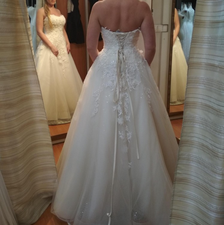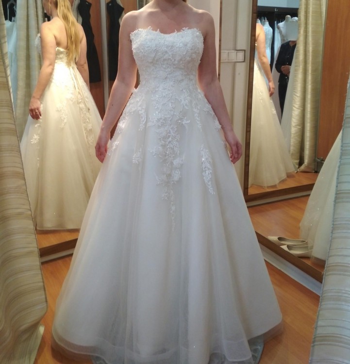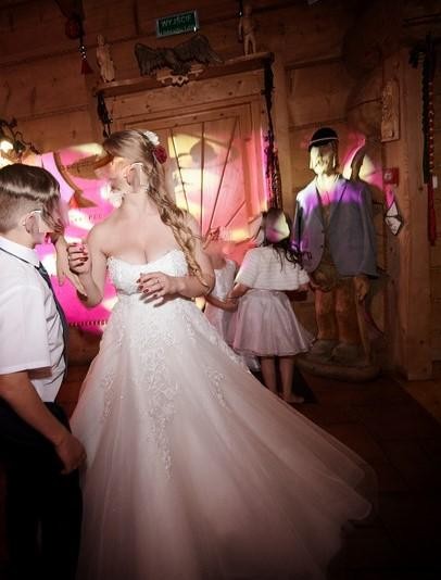 Mam do sprzedania suknię ślubną PAULETTE z salonu sukien ślubnych Boston. Suknia w rozmiarze 36/38 (wiązana), wzrost 166 cm + 12 cm obcas, kolor ivory. Składa się z 9 warstw dzięki, którym ma piękny fason bez potrzeby stosowania niewygodnego koła. Góra- wiązany gorset, dzięki wszytej gumie suknia trzyma się nawet kiedy gorset jest nie związany. Materiały najlepszego gatunku odróżniały ją od innych sukien, które zmierzyłam szukając tej jedynej, poza tym zdobiona jest modnymi w tym sezonie kwiatami 3D. Na zdjęciach tego nie widać, ale w słońcu i wieczorem w światłach suknia się błyszczy, ponieważ druga warstwa ma wszyte maleńkie kryształki, efekt jest piękny, nie jest przesadzony. Dzięki wiązaniom dopasuje się do każdej sylwetki, pięknie podkreśla talię .Suknia cudownie się kręci. Byłam z niej bardzo zadowolona i na pewno wybrałabym ją po raz drugi. Cena w salonie 3900 zł. Sprzedaję za 1500 zł. Dokładam do tego 3 metrowy welon gratis oraz nową podwiązkę. Sukienka dostępna na terenie Krakowa lub okolic Krynicy-Zdroju.