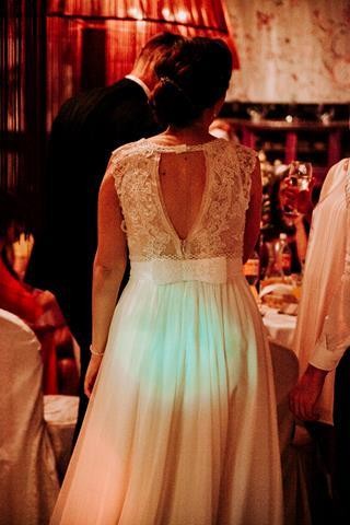 suknia na dole ma kilka warstw, wszystkie muślinowe. na górze jest koronka z siateczką oraz wkładkami w miejsce biustu dzięki czemu nie ma potrzeby zakładania biustonosza. cześć górna i dolna jest oddzielona paskiem podkreślającym talie. plecy sa częsciowo odkryte, materiał przylega do skóry dzieki wszytemu silikonowi. Sukienka jest bardzo lekka i pięknie układa się podczas tańca.