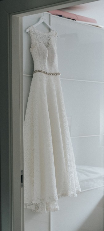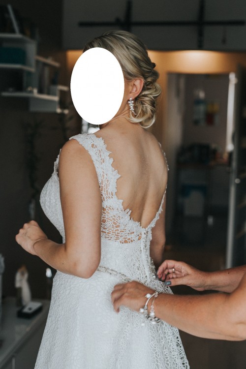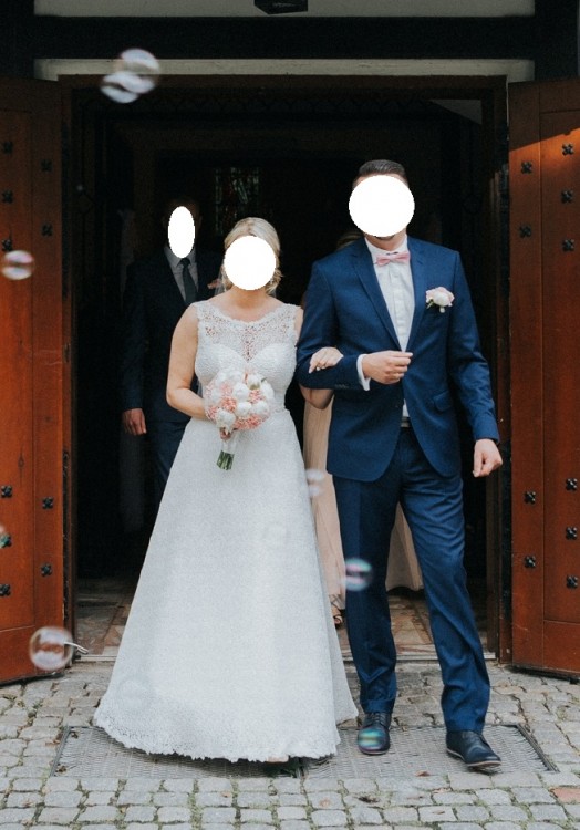 Jest to jedyny i oryginalny model, ponieważ sukienka miała przerabiany według mojego pomysłu tył sukni. Jest wykonana z pięknej koronki, ma odkryte plecy. Sukienka o linii A. Pięknie się układa i jest bardzo wygodna. Tył sukni jest lekko dłuższy, lecz jest możliwość podpięcia go. Sukienka jest odpowiednia na rozmiar 36 i 38 ponieważ tył ma regulowany, wiązany i dopasowuje się do sylwetki. Szyta na wzrost 164cm + obcas 8-12cm. Dodatkowo w komplecie jest również pasek wykonany z ozdobnych, mieniących się kamyczków, który pięknie ozdabia talie. Dla zainteresowanych w komplecie oddam również piękny, delikatny welon obszyty delikatną koronką. Suknia została profesjonalnie wyczyszczona. Zapraszam do obejrzenia i przymiarki.