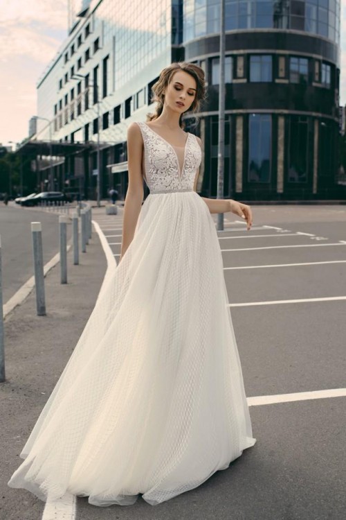 Suknia jest dla osób o wzroście ok 166 cm (obcas ok 10 cm). Jest to suknia jednoczęściowa z dekoltem na plecach w kształcie litery V. Z przodu dość głęboki dekolt, również w kształcie V. Suknia ma wyszytą błyszczącą nitką kratę, co daje jej niecodzienny charakter.