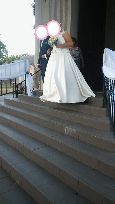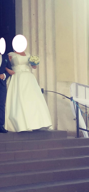 Sprzedam suknię ślubną wykonaną z materiału mikado w kolrze ecru. Suknia pięknie się układa, doskonale tuszuje wszystkie niedoskonałości