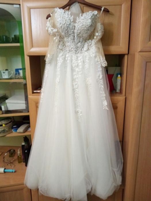 Suknia z pod projektu Diany "PRIMA COSTA" w przepięknym kolorze Ivory (kość słoniowa). Krój sukienki to literka A pasująca dla kobiet o różnej budowie ciała. Podkreśla dekolt i ramiona dzięki cudownym koronkom z mieniącymi się koralikami. W suknie wszyte są miseczki (miseczka C). Jest możliwość wstawienia poduszek, które uwydatnią biust. Rękawki są mniej więcej 3/4 zakończone koronką. Tył w całości jest zapinany na perłowe guziki dodające uroku całej sukience. Dół składa się z warstwy podszewki i kilku warstw tiulu, który nie uległ zniszczeniu. Suknia była szyta na 165 cm + 9 cm obcas. Suknia jest wyprana w pralni chemicznej i gotowa do zakupu przez nową właścicielkę.
