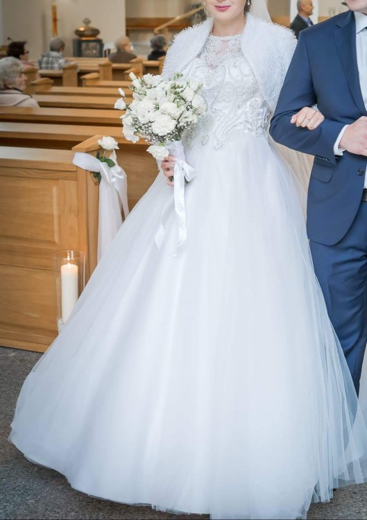 Na sprzedaż mam przepiękną suknię ślubną typu princessa. Bogato zdobiona przód i tył kryształkami Swarovski. Suknia już po praniu chemicznym. Do sukni dodaje bolerko i ozdobę do włosów i halke na kole, która można założy bądź nie i tak pięknie się prezentuje. Zdjęcia nie oddają piękna sukni jak w rzeczywistości. Zapraszam do przymiarki w Koninie.