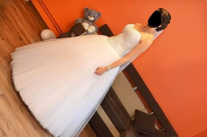Gorset sukni pokryty koralikami imitującymi perły, dekolt w kształcie serca, z tyłu regulacja. Dół sukni pokryty warstwami tiulu, jedna z nich pokryta brokatem, przez co suknia pięknie się mieni. W zestawie z suknią dołączam halkę z kołem i 2 welony (dlugi i krótki). Suknia została wyczyszczona chemicznie i czeka na nową właścicielkę.