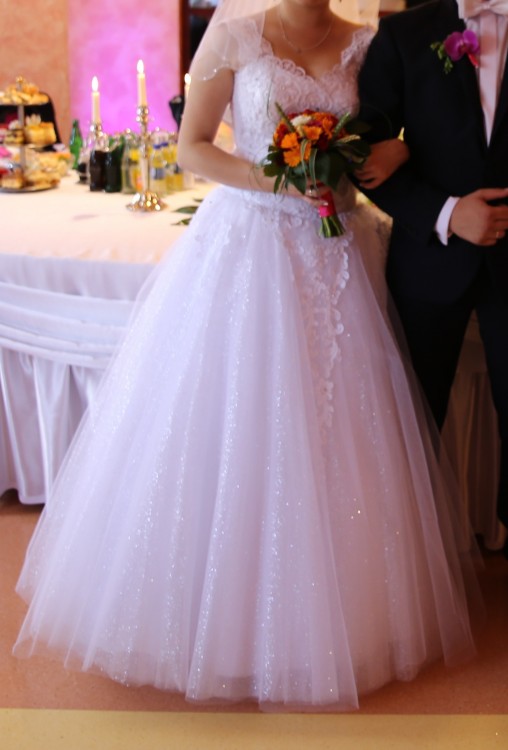 Mam do sprzedania suknię ślubną w kolorze białym, rozmiar 38/40.