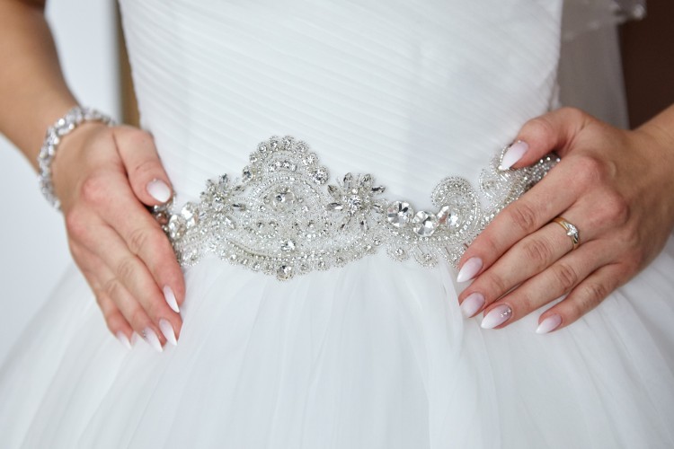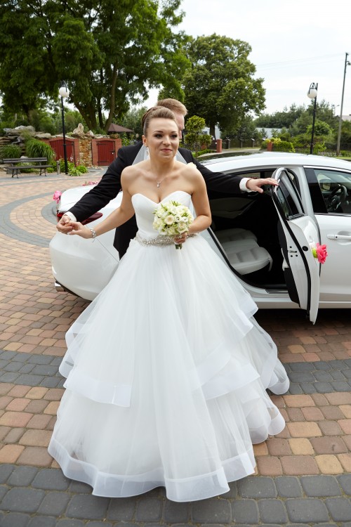 Sukienka zawdzięcza swoją wyjątkowość szerokiej spódnicy z falbanami, drapowanemu gorsetowi w serduszko oraz podkreślającemu talię paskowi z kryształków, wszystkie te elementy w pozytywny sposób zwrócą uwagę nie tylko pana młodego, ale