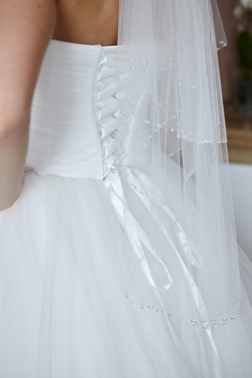 Suknia jest w rozmiarze 38, jednak dzięki wiązanemu gorsetowi spokojnie będzie pasować na rozmiary S, M, L. Co więcej po odpowiednim zawiązaniu gorsetu, sukienka jest nie do ruszenia, mam tutaj na myśli to, że nie ma szans, aby się „przemieściła”.