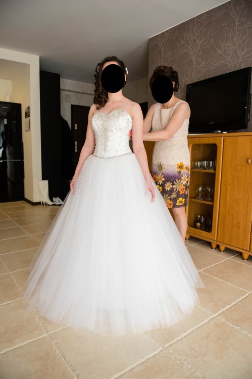 Suknia jest koloru białego w rozmiarze 36, na wzrost 160cm + około 5cm but . Góra sukni to gorset pięknie zdobiony kamieniami typu svarowski. Gorset pięknie modeluje sylwetkę, jest wiązany, dlatego istnieje możliwość dopasowania do figury - idealnie uszyty, dobrze się trzyma i nie opada.