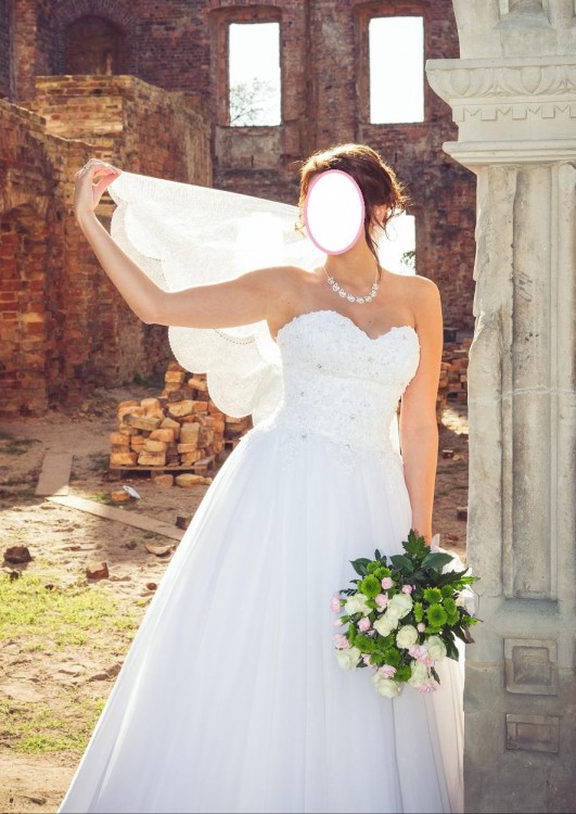 Sprzedam śliczną Suknię Ślubną nowej Pannie Młodej :). Suknia śnieżno biała typu princessa na kole, z gorsetem wiązanym taśmą. Gorset koronkowy wyszywany kryształkami. Pięknie eksponuje biust. Tiul wymieniony na włoski, aby się nie podwijał, a opadał w dół. Pod tą warstwą jest warstwa z brokatem, który mieni się w świetle weselnych reflektorów. Rozmiar waha się od 36 do 38 (w zależności od ściśnięcia gorsetu). Pasować będzie na osoby o wzroście ok. 167cm (bądź niższe po skróceniu). Świeżo po czyszczeniu w pralni. Stan oceniam na bardzo dobry (suknia zakupiona w salonie-kosztowała 3550 zł). Suknię sprzedaję w komplecie z: