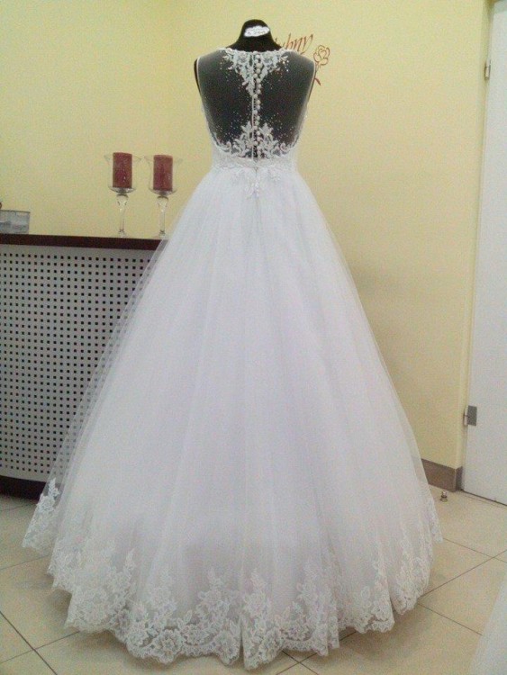 Suknia ozdobiona elegancką, delikatną koronką. Gorset sukni wykonany jest w postaci koszulki z odciętymi rękawami i ozdobione ręcznie wykonanymi aplikacjami. Plecy wykończone zostały cienką koronką, ozdobioną aplikacjami oraz kryształkami Swavorskiego, które nadają sukni elegancji. Dodatkowo pod różnym światłem kryształki zmieniają swoją barwę, dzięki czemu suknia nabiera dodatkowego uroku.