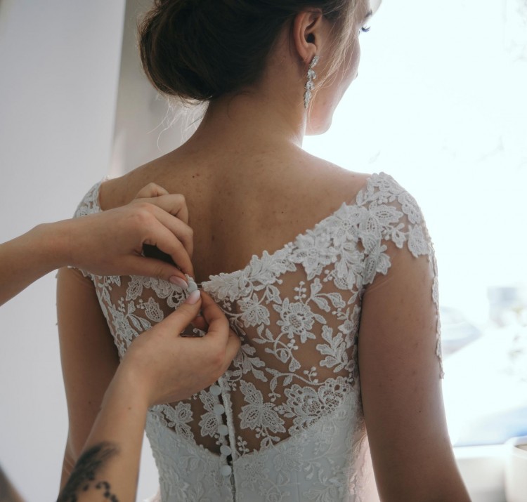 Ze względu na długi rękaw i zdobiony koronką dekolt, suknia nie wymaga dodatkowej biżuterii, poza kolczykami.