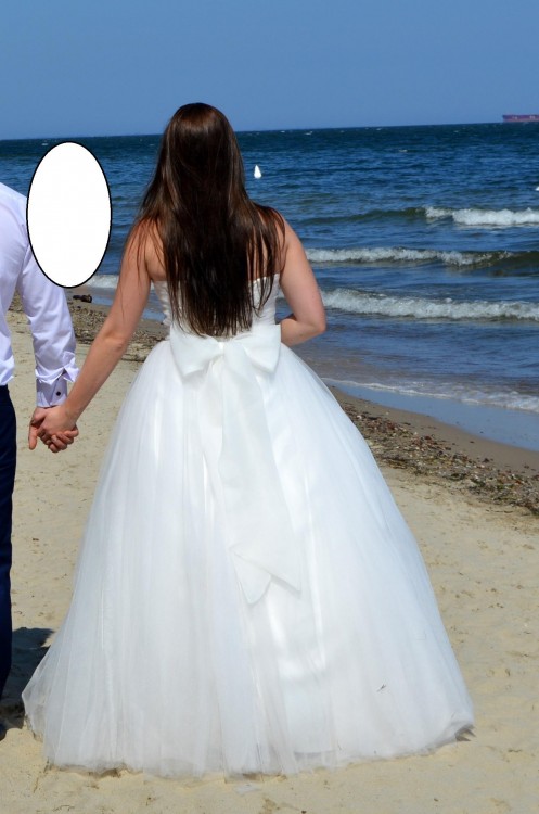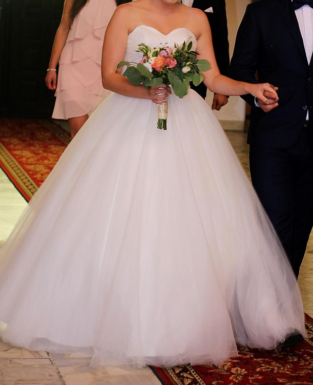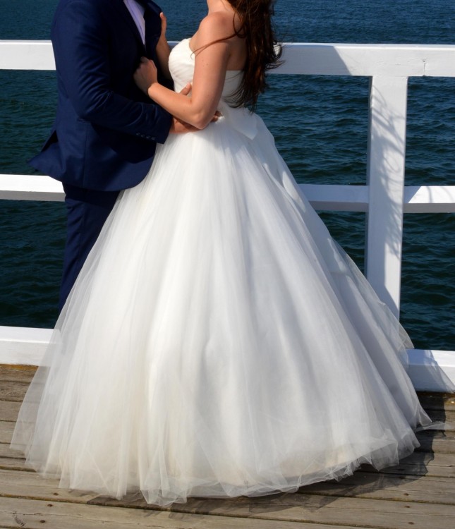 Sprzedam suknię ślubną princeskę w kolorze ivory na wzrost 164 cm plus 6-7 cm obcas. Suknia ma 4 warstwy tiulu, jest wiązana z tyłu, dlatego łatwo ją dopasować od rozmiaru 34 po 42. Dzięki wszytym przezroczystym haftkom, suknia doskonale się trzyma. Jest wygodna i lekka. W biuście ma wszyte usztywnienia, dzięki czemu nie trzeba zakładać biustonosza.