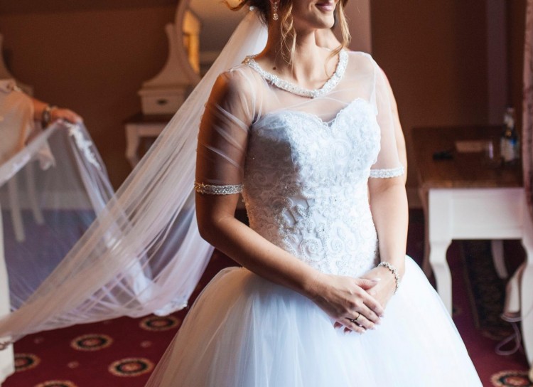 Witam mam do sprzedania piękną suknie ślubną typu princessa w rozmiarze 38. Gorset jest wysadzany kamienimi typu svarowski, jest wiązany z tyłu dzięki czemu można go dopasować idealnie do figury. Dołączam również bolerko oraz dwa welony krótki i długi. Cena do małej negocjacji.