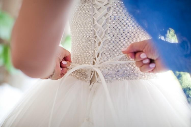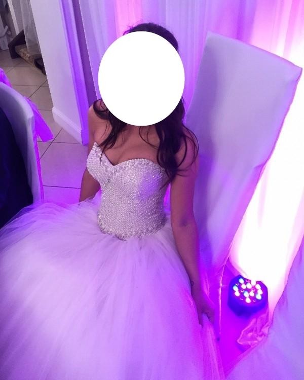 Suknia typu Princeska z gorsetem wysadzanym kamieniami Swarovskiego robi piorunujące wrażenie. Rozmiar sukienki to 34/36. Gorset jest wiązany więc ze spokojem można go dopasować. Długość sukni to 164cm plus obcas 10 cm.