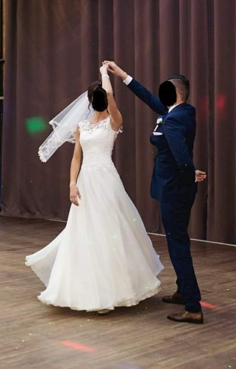 Kolor sukni to ECRU zaś na zdj wychodzi biała, suknia jest lekka, zwiewna super układa się w tańcu, krój sukni to litera A, posiada też halkę która ma 3 warstwy zastępujące "koło"aby lekko układa się w literę A.
