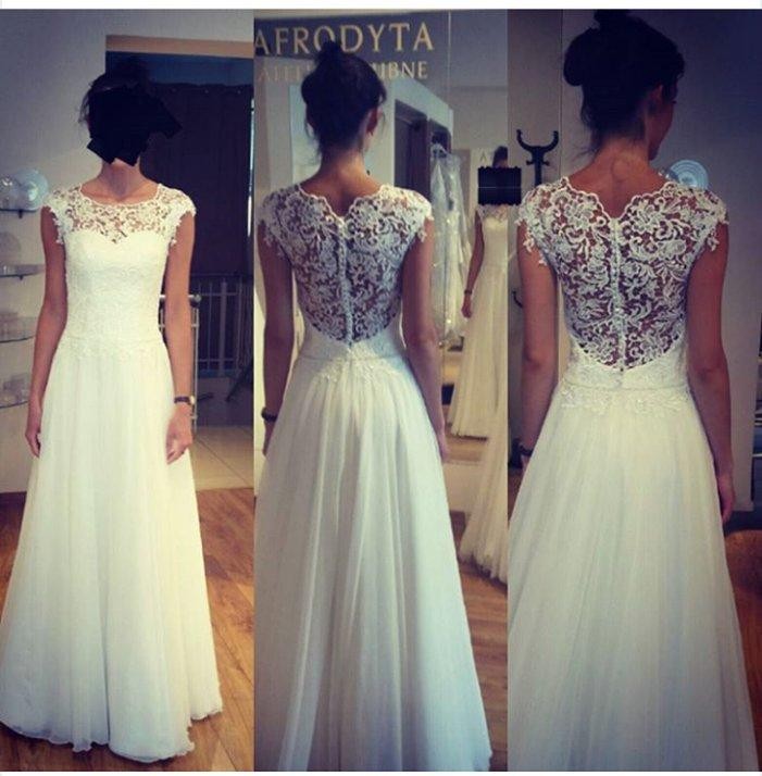 Góra sukni wykonana jest z koronki, tył sukni jest zabudowany koronką i wycięty co widać ładnie plecy przez koronkę, stanik wszyty pod suknię w rozm. 70 B