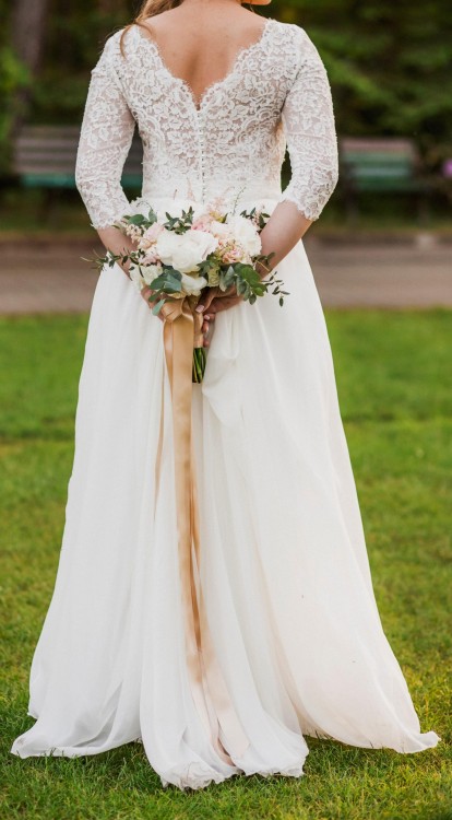 Dół wykonany jest z muślinowego jedwabiu. Posiada również podpinany tren. Suknia jest w kolorze złamanej bieli (off- white), dopasowana do wzrostu 169 cm + 5 cm obcas.