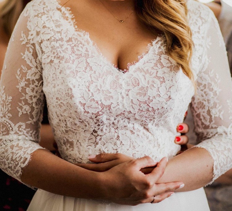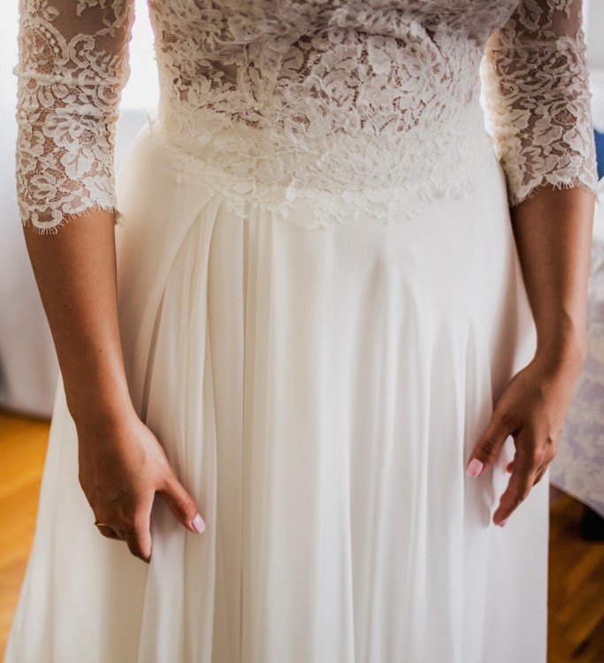 Góra sukni jest uszyta z jedwabnej, delikatnej i romantycznej koronki. Z tyłu i z przodu posiada dekolt w kształcie litery "V" eksponujący pełniejszy biust. Pod spód koronki wszyty jest cielisty gorset zapinany na suwak. Rękaw 3/4.